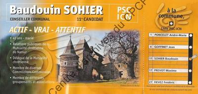 Imprimé électoral de conseiller communal PSC de Namur Baudouin Sohier réalisé à l'occasion des élections communales du 8 octobre 2000.