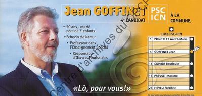 Imprimé électoral de l'échevin PSC de Namur Jean Goffinet réalisé à l'occasion des élections communales du 8 octobre 2000.