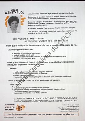 Imprimé électoral de la candidate de la liste PSC-ICN Claude Wanet-Ruol réalisé à l'occasion des élections communales du 8 octobre 2000 à Namur.
