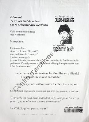 Imprimé électoral de la candidate de la liste PSC-ICN Jacqueline Callens-Willemaers réalisé à l'occasion des élections communales du 8 octobre 2000 à Namur.