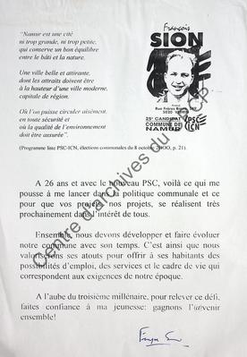 Imprimé électoral du candidat de la liste PSC-ICN François Sion réalisé à l'occasion des élections communales du 8 octobre 2000 à Namur.