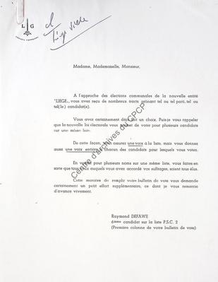 Imprimé électoral du candidat PSC de Liège Raymond Defawe réalisé à l'occasion des élections communales du 10 octobre 1976.