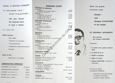 Imprimé électoral du bourgmestre PSC de Sprimont Georges Flagothier réalisé à l'occasion des élections communales du 10 octobre 1976.