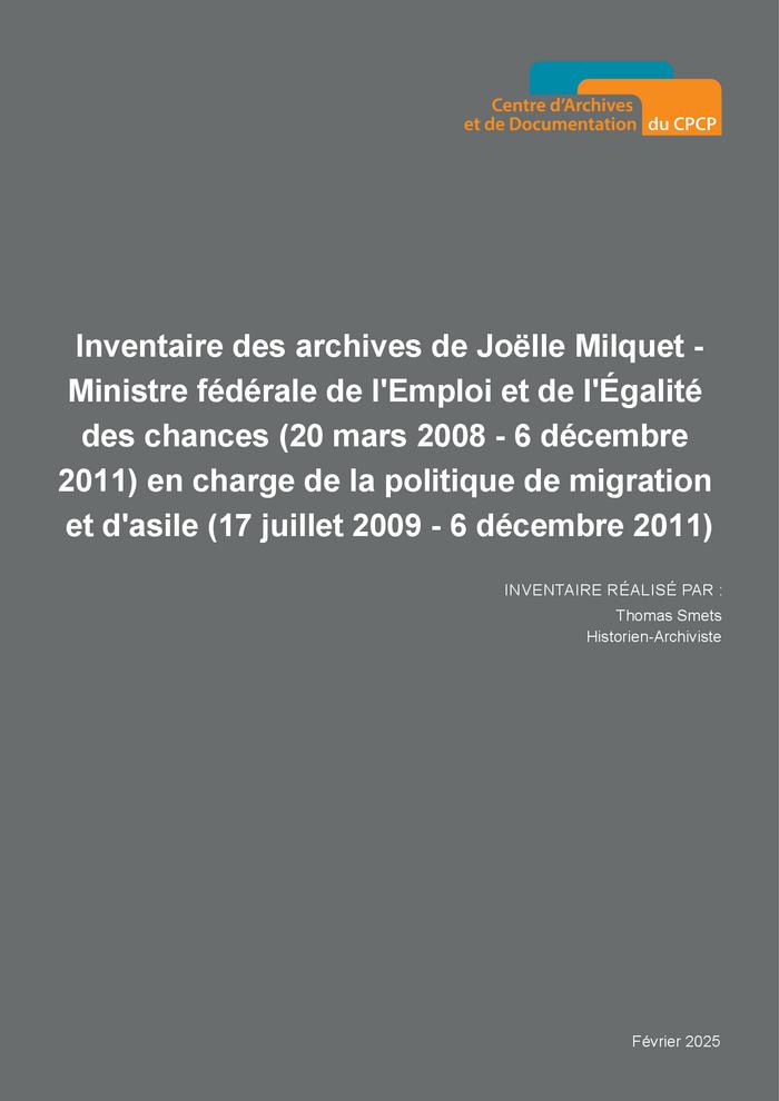 Les archives de Joëlle Milquet en sa qualité de vice-Première ministre, ministre de l’Emploi et de l’Égalité des chances (20 mars 2008 - 6 décembre 2011) et chargée de la Politique de Migration et d'Asile dans le gouvernement Leterme II jusqu'au 6 décembre 2011 ont été versées en 2017 au centre d'archives du CPCP alors situé à la rue des Deux-Eglises à Bruxelles. En août 2020, ces archives ont été transférées dans les nouveaux locaux du centre d'archives du CPCP à Louvain-la-Neuve.