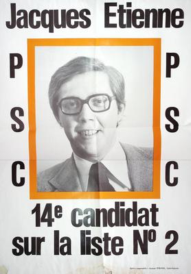Affiche électorale du candidat PSC namurois Jacques Etienne réalisée dans le cadre des élections communales du 10 octobre 1976.