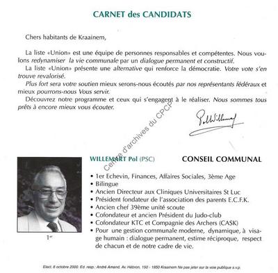 Imprimé électoral de la liste Union (PSC-PRL-FDF-EUR) à Kraainem réalisé à l'occasion des élections communales et provinciales du 8 octobre 2000.