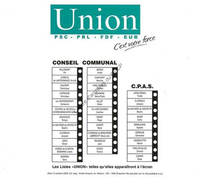 Imprimé électoral de la liste Union (PSC-PRL-FDF-EUR) à Kraainem réalisé à l'occasion des élections communales et provinciales du 8 octobre 2000.