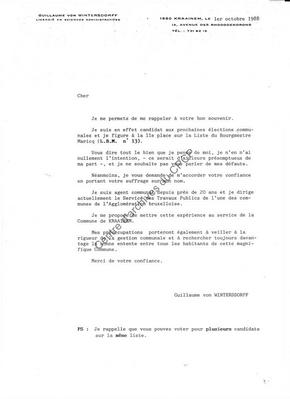 Imprimé électoral du candidat PSC de Kraainem Guillaume von Wintersdorff réalisé à l'occasion des élections communales du 9 octobre 1988.