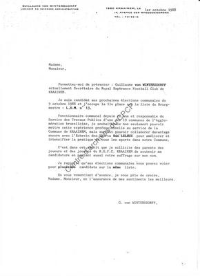 Imprimé électoral du candidat PSC de Kraainem Guillaume von Wintersdorff réalisé à l'occasion des élections communales du 9 octobre 1988.