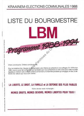 Programme 1988-1994 de la liste du bourgmestre, dont faisait partie le PSC, à Kraainem à l'occasion des élections communales du 9 octobre 1988.