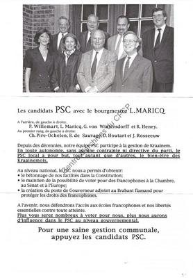 Imprimé électoral de candidats PSC de Kraainem réalisé à l'occasion des élections communales et provinciales du 9 octobre 1994.