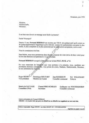 Imprimé électoral de membres du PSC de Kraainem en faveur du député européen PSC Fernand Hermand réalisé à l'occasion des élections européennes du 12 juin 1994.