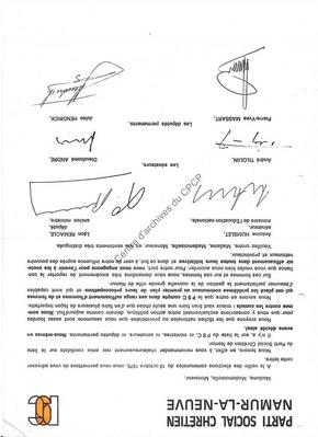 Imprimé électoral de soutien des députés et sénateurs PSC namurois aux candidats PSC de Namur réalisé à l'occasion des élections communales du 10 octobre 1976.