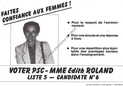 Imprimé électoral de la candidate PSC de Lasne Edith Roland réalisé à l'occasion des élections communales du 10 octobre 1982.