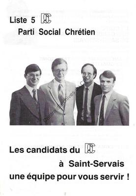 Imprimé électoral des candidats PSC de Saint-Servais (Namur) réalisé à l'occasion des élections communales du 10 octobre 1982.