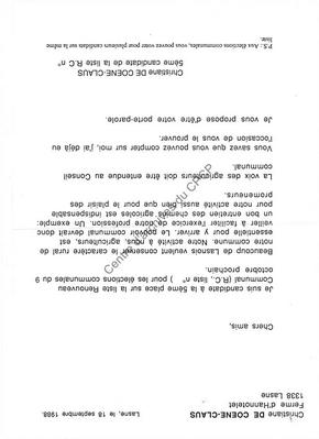 Imprimé électoral de la candidate de la liste Renouveau Communal (tendance PSC) de Lasne Christiane De Coene-Claus réalisé à l'occasion des élections communales du 9 octobre 1988.