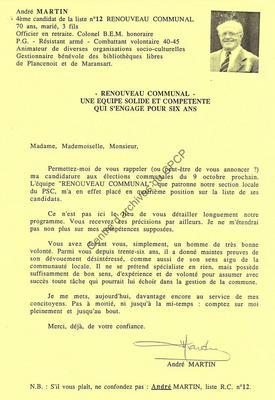 Imprimé électoral du candidat de la liste Renouveau Communal (tendance PSC) de Lasne André Martin réalisé à l'occasion des élections communales du 9 octobre 1988.