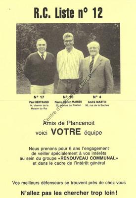 Imprimé électoral de candidats de la liste Renouveau Communal (tendance PSC) de Lasne réalisé à l'occasion des élections communales du 9 octobre 1988.