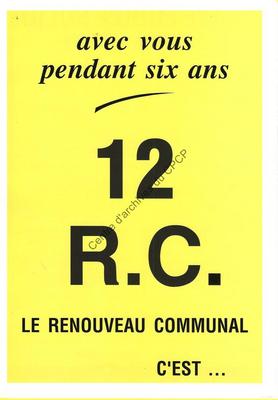 Imprimé électoral de la liste Renouveau Communal (tendance PSC) de Lasne réalisé à l'occasion des élections communales du 9 octobre 1988.