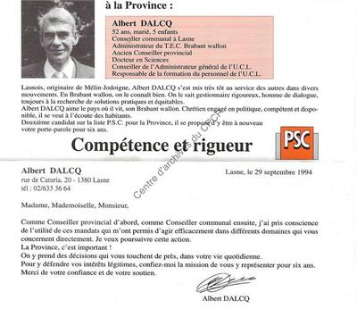 Imprimé électoral du candidat de la liste Renouveau Communal (tendance PSC) Albert Dalcq réalisé à l'occasion des élections communales et provinciales du 9 octobre 1994.