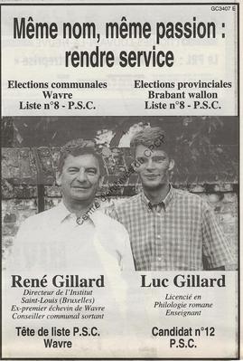 Imprimé électoral des candidats PSC René Gillard et Luc Gillard réalisé à l'occasion des élections communales et provinciales du 9 octobre 1994.