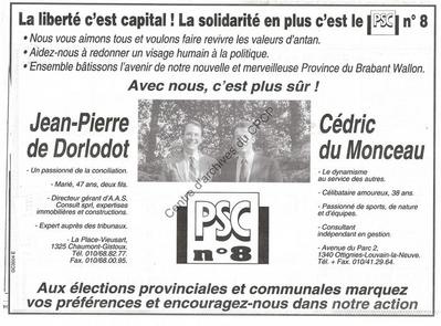 Imprimé électoral des candidats PSC Jean-Pierre de Dorlodot et Cédric du Monceau réalisé à l'occasion des élections communales et provinciales du 9 octobre 1994.