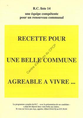 Imprimé électoral de la liste Renouveau Communal (tendance PSC) réalisé à l'occasion des élections communales et provinciales du 9 octobre 1994.