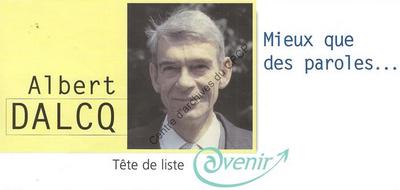 Imprimé électoral du candidat de la liste Avenir (tendance PSC) Albert Dalcq réalisé à l'occasion des élections communales et provinciales du 8 octobre 2000.