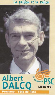 Imprimé électoral du candidat PSC Albert Dalcq réalisé à l'occasion des élections communales et provinciales du 8 octobre 2000.