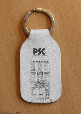 Porte-clef avec une représentation de la maison du PSC situé à la rue des Deux-Eglises à Bruxelles.