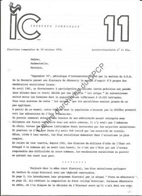 Imprimé électoral de la liste Intérêts Communaux (incluant des candidats PSC) de Frameries réalisé à l'occasion des élections communales du 10 octobre 1976.