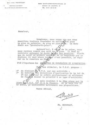 Imprimé électoral du candidat PSC Philippe Maystadt réalisé à l'occasion des élections législatives et provinciales du 17 avril 1977.