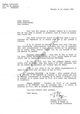 Imprimé électoral du Ministre du Budget et de la Politique scientifique Philippe Maystadt en faveur du président du PSC Gérard Deprez, du sénateur PSC Raymond Langendries et du candidat PSC Jean-Paul Delfosse réalisé à l'occasion des élections législatives et provinciales du 13 octobre 1985.