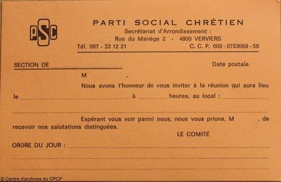 Cartons d'invitation aux réunions des sections locales de l'arrondissement PSC de Verviers