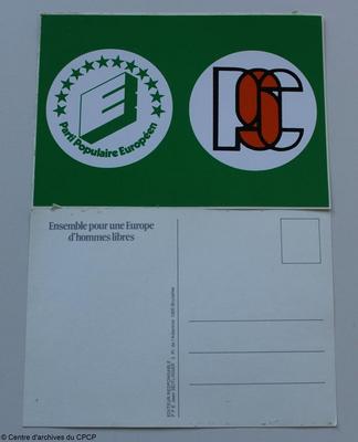 Cartes postales autocollantes vertes avec, au recto, les logos du PSC et du PPE, et au verso, le slogan de la campagne du PPE pour les élections européennes de 1979 "Ensemble pour une Europe d'hommes libres"