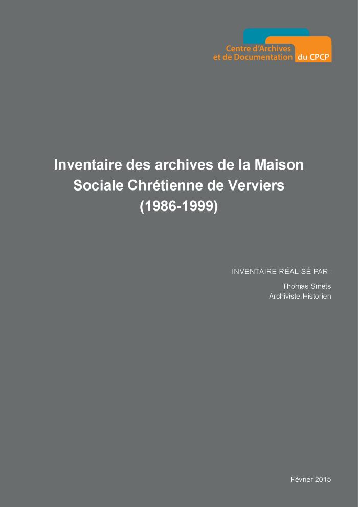 Les archives de la « Maison Sociale Chrétienne » de Verviers ont toujours été conservées dans les caves de la société coopérative au 2, rue du Manège à Verviers. Celles-ci ont été versées au centre d’archives et de documentation du CPCP en décembre 2014 dans le cadre d’une convention de don.