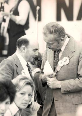 Portrait d'Antoine Humblet (1922-2011) réalisé à l'occasion d'un rassemblement des militants, des candidats et des personnalités du PSC à l'approche des élections communales du 10 octobre 1976 pour lesquelles la liste n°2 avait été attribuée au Parti Social Chrétien.